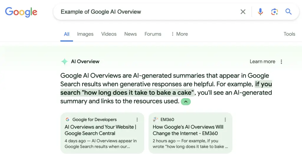 Instead of “10 blue links,” users receive a summary often with cited sources.